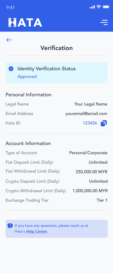 Your Hata ID will be displayed alongside your KYC (Know Your Customer) verification details.